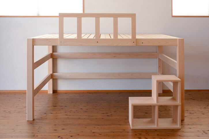高さ113cm、ヘッド・フットに柵のない、フラットタイプのロフトベッド ベッドへの登り降りは、通常ハシゴ型のもので制作していますが、 & … 続きを読む ひのき無垢 ロフトベッド[ダブルサイズ]