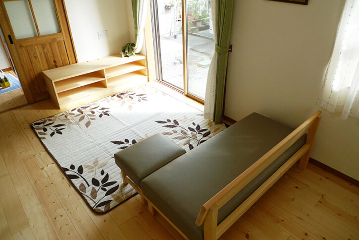 リビングダイニングの家具を一式、ご注文いただきました ビニールレザー(カフェオレ色)仕様の、ひのきソファ&オットマン   … 続きを読む 納品事例 [リビングダイニング一式]
