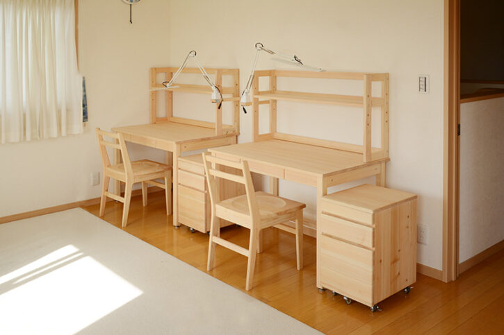 兄弟同じ、Siデスクの学習机セット 机下にワゴンを収納することも出来ますが、 机下のスペースを広々使えるように、ワゴンは机 … 続きを読む 納品事例 [Siデスクセット]