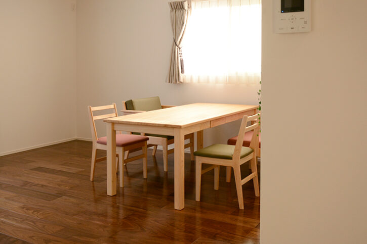 Pテーブルのダイニングセットをお届け 設置場所は2階のリビング ダークブラウンの床に、違和感無く溶け込む檜素材   … 続きを読む 納品事例 [帆布仕様のダイニングセット]