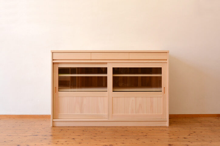 上部/引出3杯 下部/ガラス+板戸の食器棚 扉オープン! 引き戸は … 続きを読む ひのき無垢 引出付き引き戸食器棚
